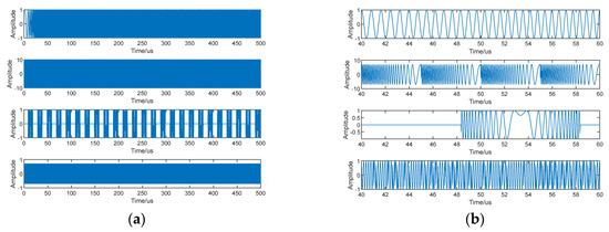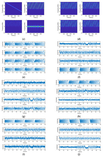 Figure 4 shows the time and time–frequency plots of the source signal, observed signal (first four channels), and separated signal at SNR = 10 dB and JSR = 20 dB. The waveform plots of 40–60 us are taken for a clear display. From the source signal time–frequency diagram, it can be seen that the source signals overlap each other in the time–frequency domain, which is difficult to be separated by the traditional filtering method. Since the jamming is relatively large, the observed signal has been basically covered by the jamming signal, and only the time–frequency points of the jamming model can be seen.