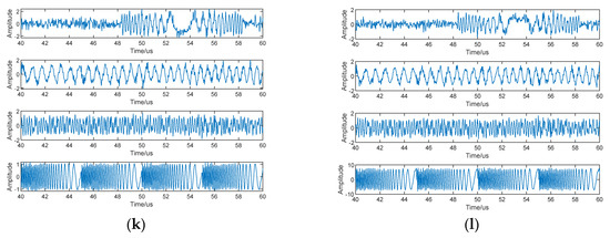 Time domain and time–frequency domain plots of the source signal, observed signal (first four channels), and separated signal at SNR = 10 dB and JSR = 20 dB. (a) Source signal waveform (0–500 us), (b) source signal waveform (40–60 us), (c) source signal time–frequency diagram, (d) observed signal time–frequency diagram, (e) observed signal waveform, (f) separated signal waveform (JADE), (g) separated signal waveform (cFastICA), (h) separated signal waveform (SOBI), (i) separated signal waveform (RobustICA), (j) separated signal waveform (FAGD), (k) separated signal waveform (proposed), (l) separated signal after amplitude phase correction (proposed).