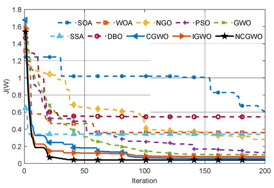 Figure 5 is the objective function curve of Equation (26) obtained by 30 times Monte Carlo with different algorithms. The CGWO [35], IGWO [36], WOA [38], SOA [39], NGO [40], PSO [41,42], SSA [43], and DBO [44] are all excellent swarm intelligence optimizers proposed in recent years. The above optimizers all have the problems of prematurity and low accuracy in different degrees. Compared with GWO, IGWO, and CGWO, NCGWO demonstrates higher convergence speeds and solution accuracy by incorporating improved strategies such as a nonlinear convergence factor and chaotic disturbance strategy. The integration of these strategies enables the NCGWO to generate more dominant solutions, surpassing the performance of the aforementioned optimizers. Compared with all the above algorithms, the NCGWO proposed in this paper has high accuracy and a fast convergence speed, making it very suitable to solve CVBSS problems.