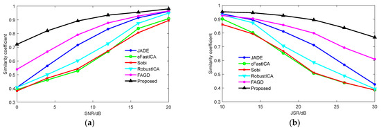 Average similarity coefficients under different SNR and JSR. (a) Average similarity coefficient under different SNR, (b) average similarity coefficient under different JSR.