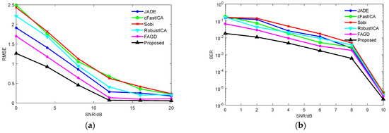 Figure 7a shows the mean square error of DOA estimation under different SNRs. With the increase in SNR, the DOA estimation RMSE decreases. Obviously, compared with traditional methods, the proposed algorithm is closer to the real value and has higher estimation accuracy. Figure 7b is the BER under different SNRs after coherently demodulating the separated QPSK signal. When the SNR is greater than 10 dB, the BER is 0, so the BER of 0–10 dB is given in the figure. With the increase in SNR, the BER decreases. Because of the high separation accuracy of the proposed algorithm, the BER under the same SNR is lower than that of other algorithms.