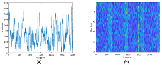 The observed signal is separated using the JADE and pulse compression is performed on the radar echo signal. As shown in Figure 9, multiple spikes appear and the distance at the first spike is not the true distance of the target, resulting in incorrect target detection. After performing pulse compression on multiple pulses, multiple blurred points appear and the distance of the target cannot be estimated. This is caused by the low separation accuracy of the JADE under a low SNR and high JSR.
