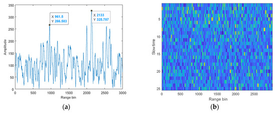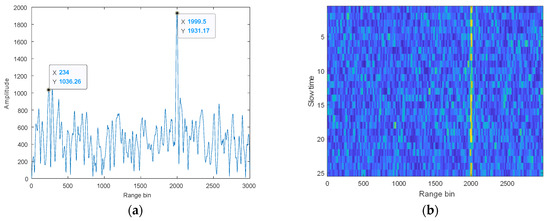 Figure 10 shows the pulse compression for single and multiple pulses after the separation of the observed signals by the proposed algorithm. Pulse compression of a single pulse shows that the first spike is approximately 700 higher in amplitude than the second spike, and the target distance can be successfully detected. After compressing multiple pulses, a clearer line can be seen, and thus the target distance can be estimated.