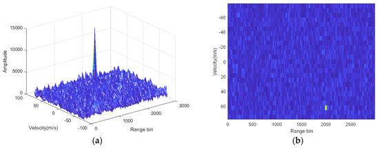 Figure 11 shows the three-dimensional and two-dimensional plots of the pulse Doppler processing of the radar echo signal, using the proposed algorithm. A peak and a bright spot can be seen in the three-dimensional and the two-dimensional plot, respectively. The proposed algorithm can successfully estimate the target distance and velocity.