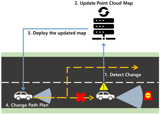 For autonomous vehicles, the rapid perception of changes in the surrounding environment is essential. Substantial research on the perception of surrounding environmental changes through various sensors is ongoing, in particular research using LiDAR (light detection and ranging) sensors. LiDAR sensors use laser pulses to extract information about objects in the surrounding environment as three-dimensional (3D) point cloud data. Autonomous driving technology has been developed that uses these point cloud data to cope with potential obstacles or sudden situations [1]. More broadly, autonomous driving technology using point cloud data helps autonomous vehicles create safe, optimized local routes in rapidly changing road traffic situations. While autonomous driving route creation technology using the Global Positioning System (GPS) is very useful, GPS signal is frequently interrupted or inaccurate in the real world. In such cases, an autonomous vehicle must generate its route using a 3D precision map created from point cloud data for their surroundings collected from LiDAR sensors [2]. The currency of these point cloud data is a crucial factor in creating safe routes for autonomous vehicles. Figure 1 illustrates an example of subsequent vehicles altering their paths through a point cloud map server that ensures point cloud data currency. Figure 1 represents the following process: (1) When a preceding vehicle navigates based on the existing map and detects changes, (2) the server updates the point cloud map to incorporate these changes. (3) After distributing the updated map, (4) subsequent vehicles adjust their paths, enabling safe autonomous driving.