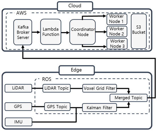 The proposed system aims to update the point cloud map in real-time using data collected from data collection vehicles. Accordingly, the system architecture of this study is divided into the Edge part, which collects LiDAR and GPS data, and the Cloud part, which is a data platform that analyzes and updates the data, as shown in Figure 2.