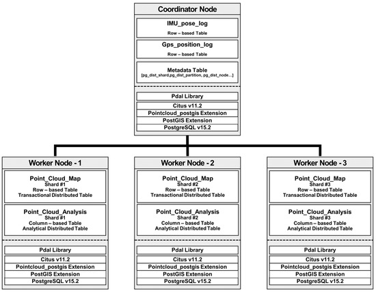The architecture proposed in this paper is HTAP (hybrid transactional/analytical processing) architecture that can simultaneously handle the OLTP (online transactional process) for point cloud data transmitted in real-time and the OLAP (online analytical process) for comparative analysis between the transmitted point cloud data and the point cloud data that generated the existing precision map. Considering the size of each set of point cloud data, performing real-time transaction processing and analysis processing on a single node is untenable. Therefore, this architecture was designed based on Citus, a distributed software extension of PostgreSQL version 15.2, and was constructed with three worker nodes and one master node.