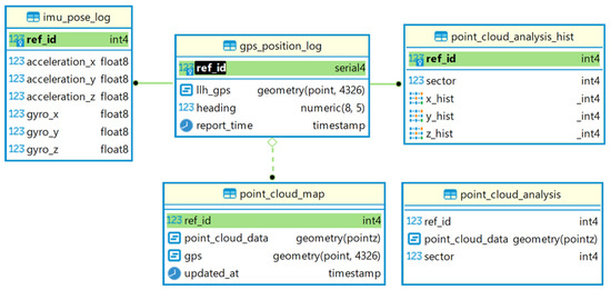 Figure 4 shows the entity relationship diagram for these tables. All tables possess a column named ref_id. The ref_id functions as an identifier allocated to data in accordance with the vehicle’s LiDAR data collection cycle, representing unique values for reported time, GPS coordinates, and heading angle. When a vehicle collects Point Cloud Data using LiDAR, the reported time, GPS coordinates, and heading angle of the vehicle are associated with a ref_id and written into the gps_position_log table. The corresponding IMU data at that moment is recorded in the imu_pose_log table, while the generated histogram is written into the point_cloud_analysis_hist table. As each of these three tables contains data rows that are uniquely associated with ref_id, they use ref_id as their primary key. Both the point_cloud_map and point_cloud_analysis tables share the same ref_id for all points captured at that moment. The point_cloud_map table consists of a point cloud data column, an updated_at column indicating when the data was last updated, and the GPS coordinates of the vehicle. Lastly, the point_cloud_analysis table is configured to categorize point cloud data based on the location of points using the sector column, enabling swift aggregation.