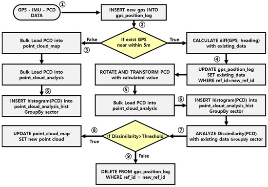 The primary objective of the system constructed in this study is to analyze data collected from LiDAR, the inertial measurement unit (IMU), and GPS sensors in real-time through the HTAP architecture. Based on the analysis results, the system updates and maintains the point cloud dataset in its latest version. This subsection provides a detailed explanation of the data processing pipeline designed to achieve this goal. Figure 5 shows the process of data handling within the system presented in this study. The detailed steps of this flow chart are described below.