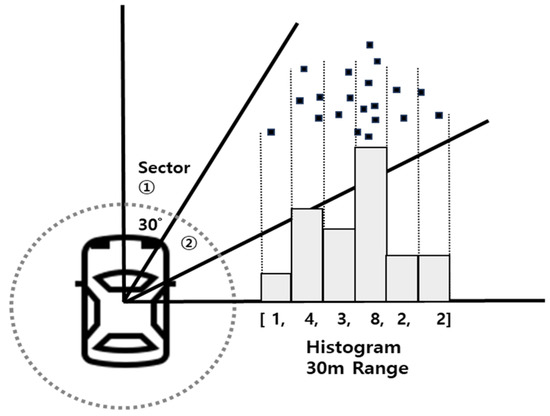 The point cloud data loaded into the point_cloud_analysis table are aggregated with points from the existing ref_id from within the same sector and within 30 m of the origin. For each sector, the average distance of points to the origin is measured and then squared. Subsequently, three histograms are generated based on the distribution of points within the same sector for the x-, y-, and z-axes, and the differences between these histograms and the histograms representing the existing ref_id are calculated. In this system, the histogram divides each axis within a sector into 59 sections from −30 m to +30 m, summing up the number of points in each section, resulting in an array of total length 60. Figure 6 depicts a top-view perspective of the vehicle, and the histogram shown in the illustration represents the distribution based solely on the x-values of points within the same sector, disregarding y and z values. Figure 6 shows the points within sector 2 categorized into 1-m intervals along the x-axis, representing the count of points within each interval using a one-dimensional array. The illustration provides an example for better understanding, using an array of length 6. However, in reality, a 60-length array ranging from −30 m to +30 m is employed for representation. This approach allows for the abstraction of complex 3D point distributions into simple arrays of three 1D histograms, reducing computation costs accordingly. Through this histogram, the clustering pattern of the points can be represented as an array, making meaningful comparisons feasible.