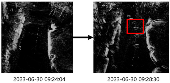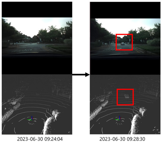 Examples of changes detected during implementation of the scenario laid out in Section 4.1 are presented in Figure 8, with the left-hand panels representing the first drive and the right-hand panels representing the second drive. The upper portion of Figure 8 displays an image captured by a monologue camera, while the lower portion depicts an image captured by the LiDAR sensor. The data captured by the LiDAR sensor were visualized using the Ros Rviz software version melodic on the Ubuntu operating system. The operation of the architecture was verified by targeting the vehicle observed during the second drive (highlighted in a red box).