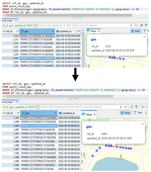 The vehicle was first detected at a longitude of 127.076675° E and a latitude of 37.5425422° N. Therefore, we examined the data from the point_cloud_map table around this location. Figure 10 compares the results obtained from querying the point_cloud_map table spatially.