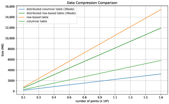 For the comparison of data compression rates, we conducted experiments with four different table types. The types of tables selected were a distributed columnar table, a distributed row-based table, a row-based table, and a columnar table. After each drive, the size of the table was measured. Figure 11 represents the measured data as a graph.