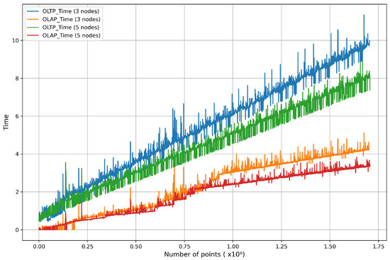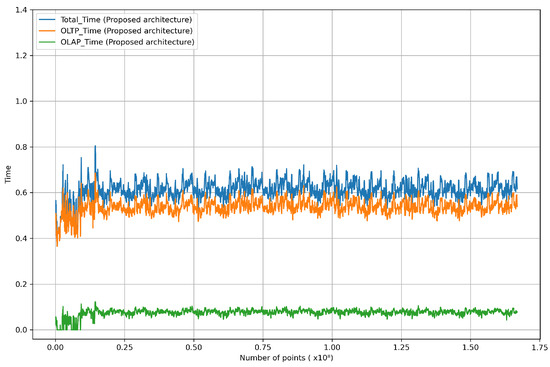 However, Figure 12 makes it clear that as the total size of the stored data increased, the system performance worsened. In the initial stages with a smaller stored data volume, the OLTP query response time was 0.86 s, and the OLAP query response time was about 0.11 s, resulting in a total response time of 0.97 s. However, as the stored data volume grew to around 160,000,000 entries, the OLTP query response time increased to 9.60 s, and the OLAP query response time reached approximately 4.28 s, summing up to 13.88 s in total. To achieve the system objective of updating point clouds in real-time, it is necessary to purge previously analyzed data. Therefore, we adopted a method of periodically purging already analyzed data from the point_cloud_analysis table to reduce unnecessary overhead. An evaluation conducted using this approach is shown in Figure 13.