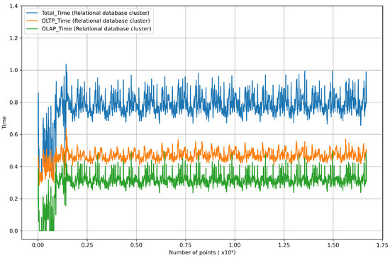 We selected a distributed RDB cluster as the comparative group for the proposed architecture. The distributed RDB cluster was built using PostgreSQL, and all configurations were similar except that they were constructed using row-based storage only, without columnar storage. Figure 14 presents the results of the same evaluation conducted on the distributed RDB cluster, which exhibited overall unstable performance metrics. The average response time for OLTP queries was 0.46209 s, and for OLAP queries, it was 0.30399 s, resulting in an average total response time of 0.76608 s. Since it was constructed using row-based tables only, it performed OLTP query response times about 0.062 s faster than the proposed architecture. However, the OLAP query response time was approximately 0.22960 s higher than that of the proposed system, resulting in nearly a threefold difference. The average total processing time was 0.795412 s, which was approximately 27% higher than that of the proposed architecture. While it was measured within our real-time criteria of less than 1 s, there were numerous instances where it slightly exceeded or approached 1 s. This divergence was attributed to the OLAP query response time, indicating an unsuitable pattern for aggregation and analysis queries.