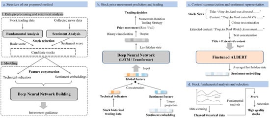 The framework of our proposed approach. (a) The structure and workflow of our proposed method. (b) The architecture of our proposed hybrid deep neural model for stock price movement prediction and trading decision. (c) The generation of sentiment embedding from the news. First, a large pretrained language model was utilized to extract summarized content, which was then concatenated with title and input to a fine-tuned ALBERT model to obtain sentiment embedding. (d) Stock fundamental analysis and selection. With the scores obtained from fundamental analysis, high-quality stocks can be preliminarily screened.