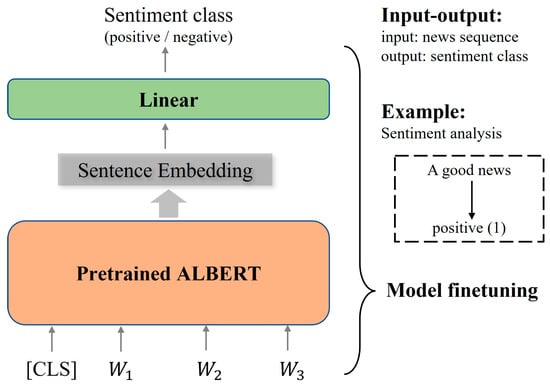 ALBERT is a lightweight version of the BERT [] model. The pretrained ALBERT model used in this study is built based on an open-source model available on Huggingface. ALBERT utilizes a Transformer encoder to extract information, with parameters set as . ChnSentiCorp contains a large number of Chinese text samples with corresponding binary sentiment labels. The dataset encompasses texts from various sources like news, covering different domains and topics. The process and an example of fine-tuning the ALBERT model on the ChnSentiCorp dataset are illustrated in Figure 2. Tokenized text sequences are input into the pretrained ALBERT model to obtain sentence representations. After passing through a fully connected layer with a dimension of 384, the model outputs binary sentiment categories. Once the ALBERT model is fine-tuned, it is subjected to end-to-end transfer learning on the collected stock news text dataset from the Chinese stock market to perform sentiment analysis. This process is consistent with the flow illustrated in Figure 2.