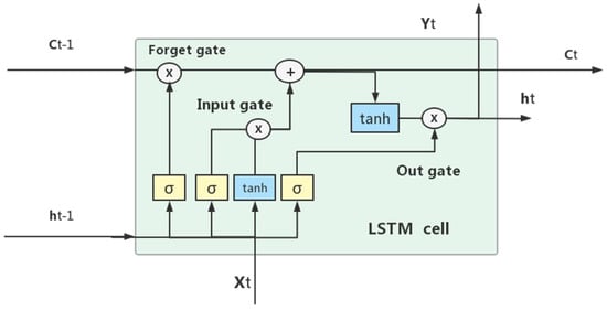 LSTM units consist of three types of gates: input gate, forget gate, and output gate. Figure 3 illustrates the operation of an LSTM unit at time t. Here, and represent the current input and output, and are the previous and current hidden states, and and are the previous and current cell states, respectively. The hidden state serves as an encoding of information learned from previous input sequences, while the cell state is a crucial component responsible for storing information extracted from past inputs. The forget gate determines how much information from the previous time step’s cell state is retained in the current time step, The formula of the forget gate is as follows: