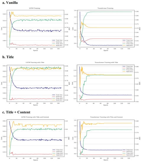 The above results analyze the importance of news content in fully reflecting news information from a statistical perspective. To further investigate the role of news information and the impact of incorporating news content, we set up three controlled experiments: Vanilla, Title, and Title + Content. Accordingly, the features for the three groups are technical factors only, technical factors + news title semantic representations, and technical factors + fused semantic representations from news titles and summarized content. For both the LSTM and Transformer models, stock rise/fall prediction is performed with models trained on the three groups separately. Figure 5 shows the average loss and accuracy curves on the training and validation sets of the two models across the three controlled groups. It can be observed that after 30 rounds of training, the models have mostly converged. There are slight performance improvements in subsequent rounds before oscillating within a range. This indicates the models are not overfitting and have generalization capability. Complete convergence is achieved at around 150 rounds.