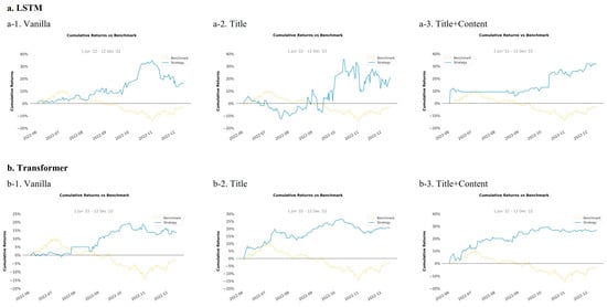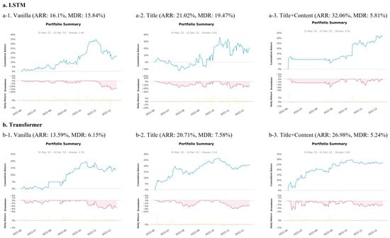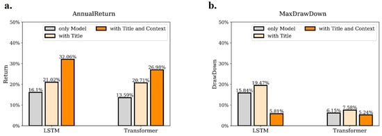 To evaluate the effectiveness of the investment strategy, we applied the strategy to the test set to simulate its past performance. In this study, we utilized an initial capital of CNY 100,000 and incurred a transaction fee of 0.025% for backtesting. The backtesting results for the LSTM and Transformer models under three control groups are presented in Figure 6. The results indicate that for both models, when incorporating news titles and summarized contents as knowledge enhancement, the strategy achieved the maximum returns. In this scenario, the ARR of both models significantly increased, from 16.1% and 13.59% to 32.06% and 26.98%, respectively. Furthermore, the LSTM model yielded higher overall returns, reaching 32.06%, whereas the Transformer model exhibited lower maximum drawdown, indicating more stable returns and reduced risk. This highlights the distinct strengths and weaknesses of the two models. The backtesting evaluation results align with the models’ ability to predict stock price trends. Notably, the inclusion of only news title sentiment representation also led to a significant increase in the ARR. However, it was accompanied by an increase in the MDR. This suggests that while news titles can provide Supplementary Information, their content might be limited and biased because of their subjective emotional tone, potentially leading to model instability. In contrast, the comprehensive improvement brought by incorporating both news titles and content summaries reflects the objective information provided by content summaries. This not only further supplements various aspects of stock information but also enhances model robustness and noise resistance through its objective sentiment.