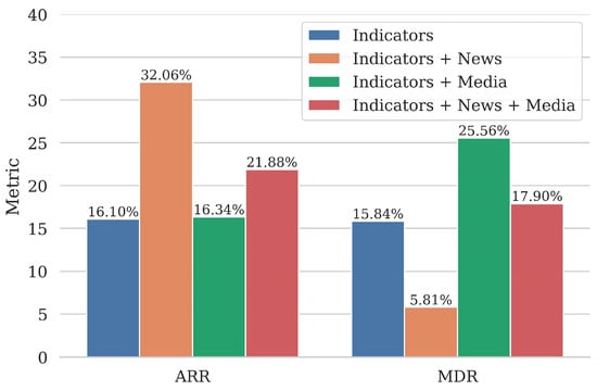 Social media sentiment has been found useful in some studies [,]. Therefore, the representativeness of news sentiment and social media sentiment are compared. We introduced social media sentiment separately into the Indicators (Vanilla) and Indicators + News (Title + Content) control groups, forming the Indicators + Media and Indicators + News + Media groups, respectively. The backtesting evaluation results for these four groups are presented in Figure 9. Compared to the Indicators group, the Indicators + Media group showed a slight improvement in ARR from 16.10% to 16.34%, but also an increase in MDR from 15.84% to 24.45%, suggesting that the introduction of social media sentiment provided relatively limited effective information. After adding social media sentiment to the Indicators + News group, the backtesting performance degraded, with ARR decreasing from 32.06% to 21.88% and MDR increasing from 5.81% to 17.90%. Both the comparisons collectively indicate that news sentiment better reflects the overall market sentiment trend than social media sentiment, thus validating the effectiveness and reliability of the comprehensive news sentiment integration in our method. Note that these discussions represent a preliminary exploration of integrating other forms of sentiment data. More systematic research is required to answer the questions.