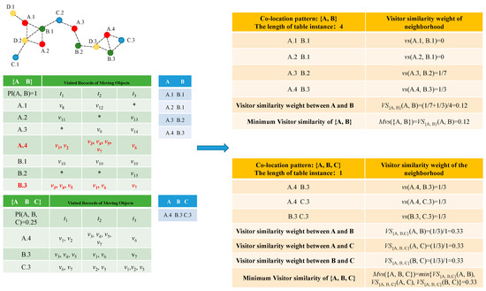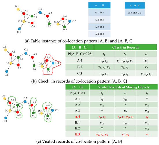 However, a spatial highly visited co-location pattern does not necessarily mean it is also frequent. The traditional frequent spatial co-location pattern mining method only considers spatial relationships. It does not reflect the visited similarity between spatial instances, resulting in the omission of some co-location patterns with high visited similarity but not frequent during the mining process. For example, Figure 1a shows the table instances of co-location {A, B} and {A, B, C}. Assuming the participation threshold min_prev = 0.5, pattern {A, B} is a frequently co-located pattern with PI({A, B}) = 1 > 0.5, while {A, B, C} is not frequently co-location pattern with PI({A, B, C}) = 0.25 < 0.5. According to Figure 1a, it can be obtained that the participating instances of {A, B} are {A.1, A.2, A.3, A.4, B.1, B.2, B.3}, and the participating instances of {A, B, C} are {A.4, B.3, C.3}. Next, we analyzed the visited information of each participating instance at three consecutive times t1, t2, and t3. We found that {A.4, B.3, C.3} were all visited by the moving object {v1, v2, v3, v4, v5, v6, v7} at different times. Among the seven instances {A.1, A.2, A.3, A.4, B.1, B.2, B.3}, except for neighboring pairs {A.4, B.3} that have been visited by similar or same instances, there is not much similarity in the moving objects between other instances that satisfy spatial proximity. For example, in neighboring pairs {A.1, B.1}, A.1 have been visited by moving v8 and v12, while the moving object in B.1 is v10. Co-location {A, B, C} are not frequent patterns, and their frequency is much lower than patterns {A, B}, but the similarity of moving objects is much greater than patterns {A, B}. According to the similarity of the visiting users, it can be seen that the attractiveness of {A, B, C} to users is higher than that of {A, B}. Unfortunately, traditional mining methods based on participation index only consider the spatial neighbor relationships, so they cannot discover patterns like {A, B, C}.