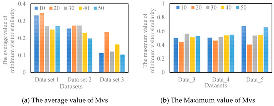 We also discussed the impact of distance threshold on minimum visitor similarity. As shown in Figure 5, we observed the changes in the mean and maximum values of Mvs by gradually increasing the distance threshold from 10 m to 50 m. The experimental results show that the changes in the average and maximum values of visitor similarity do not necessarily vary with distance. This is because the subjectivity of the visited information and the change in distance have little effect on the visitor similarity of co-location patterns.