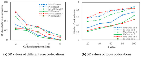 Figure 6a shows that the SR values of different sizes among the top 100 co-location patterns mined under two different metrics have been calculated. At this point, the evaluated co-location pattern set CP is the patterns of different sizes among the top 100 co-location patterns. The result indicates that the similarity ratio of the top-k mined by the PI-based method is always lower than the Mvs-based method in different datasets. From Figure 6a, it can be seen that by calculating the similarity ratio of the top-k co-location pattern under the two methods (CP pattern set consists of top-k co-location patterns under different k), it can be found that the similarity ratio of the top-k mined by the PI-based method is always lower than Mvs-based method. The experimental results verify that the high visited co-location pattern is superior to the traditional frequent co-location pattern regarding visitor similarity.