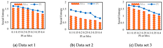 - Changing the thresholds of participation index and minimum visitor similarity. In this experiment, we change the thresholds of PI and Mvs to evaluate the social entropies of discovered co-locations. We set the spatial distance threshold d = 200 m, and we randomly selected ten days of check-in records from three datasets. For the co-locations based on PI, we change the threshold PI from 0.1 to 0.4. Figure 9 shows that the social entropies of co-locations are decreased with the increase of PIs. With the increase of PIs, the number of spatial instances that can participate in co-locations decreases, and the number of visitors who can participate in computing decreases. So, the proportion of similar visitors increases, and the social entropy decreases. For the co-locations based on visitor similarity, we change the threshold of visitor similarity from 0.1 to 0.4. From Figure 9, the social entropies of co-locations are also decreased with the increase of visitor similarity. The higher the visitor, the more similar moving objects visited the same co-location since the social entropies of co-locations are decreased with the increase of the threshold of visitor similarity. By evaluating social entropy, we can find that the co-locations based on visitor similarity have more social ties than the traditional co-locations.