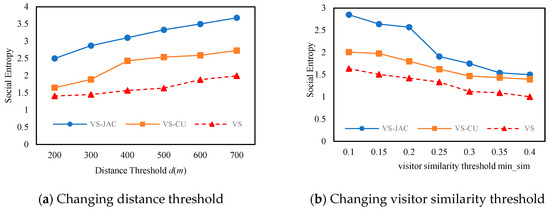 Then, we experimented with Data set 1. Firstly, we change the spatial distance threshold from 200 to 700 m. Figure 10a shows that the social entropy of our visitor similarity is always better than that of Jaccard and Contribution users. All social entropies are increased by the increase of spatial distances. In Figure 10b, when changing the visitor similarity threshold, the performance of our visitor similarity is also much lower than the other two methods. This shows that our proposed method is more suitable for mining high visited co-locations. Because it considers both visiting time and the similarity between different visitors. And when calculating the user similarity between two spatial instances, our visitor similarity weight of the neighborhood first considers similar users rather than the same users, so its results are better than Jaccard similarity. Although Contribution users consider friendship among moving objects, the friendship does not mean that they are similar users, so in this paper, we use the moving objects’ check-in history to evaluate the visitors’ similarity, which is better than the results obtained by Contribution users.