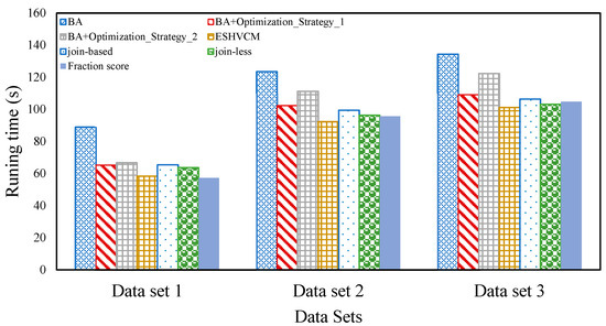 In this paper, we propose two pruning strategies: table Instance checking and Visitor Similarity Weight Checking. This section evaluates the proposed pruning strategies regarding running time and pruning rate. We set the visitor similarity threshold min_sim = 0.3, time threshold τ = five days, and we randomly selected one month of check-in records for experiments from three datasets. In Figure 11, we compare the computational times of the basic algorithm (BA) and the algorithm with pruning strategies. The running time of the latter is always less than that of the former. We also compare the running times of the algorithms proposed by this paper with the traditional mining methods, including join-based [1], join-less [9] and Fraction score [19]. Due to the addition of visited information calculation, the algorithm running time of BA is always higher than the traditional algorithms. After adding two pruning strategies, the running time of ESHVCM is already lower than the traditional algorithms. Additionally, we compared the runtime of algorithms ESHVCM, join-based, join-less and Fraction score on three datasets. As shown in Figure 12, with the distance threshold increased, the execution time of all four algorithms increased, but the execution time of ESHVCM was always lower than the other three algorithms.