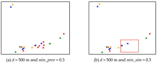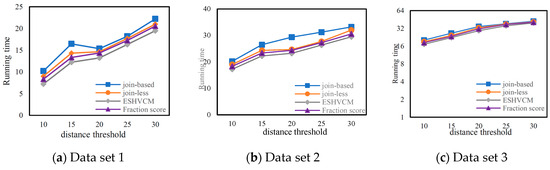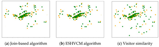 We chose the co-location <Gym/Fitness Center, Park> to show its distribution graph by different algorithms. The introduction of minimum visitor similarity has an impact on the whole mining result set, but for a single co-location pattern, its PI remains unchanged in both the Join-less algorithm and EHVSCM algorithm, which is confirmed by the distributions of <Gym/Fitness Center, Park> are exactly alike in Figure 14a,b. In Figure 14c, only considering the visitor similarity between spatial instances, we can find that its distribution is more cluttered, and there is no clustering in the EHVSCM algorithm. It can be seen that the EHVSCM algorithm mining pattern with high visitor similarity without changing the degree of participation is obtained.