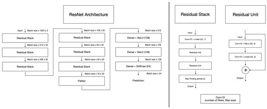 Upon the selection of signal input features, the subsequent step involves the utilization of machine learning models to discern statistical patterns within the data for classification. Classifiers such as support vector machines, decision trees, K-nearest neighbors, and neural networks are commonly used for this application [,,,,,,,,,]. Residual neural networks (ResNets), along with convolutional neural networks (CNNs), have been shown to achieve high classification performance for AMC [,,,,,,,,,]. Thus, deep learning-based methods in AMC have become more prevalent due to their promising performance and their ability to generalize to large, complex datasets comprising a variety of standard and non-standard modulation schemes.