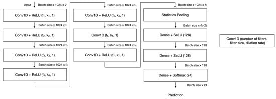 In the absence of statistical aggregations, input signals for a conventional CNN or ResNet would require resampling, cropping, or padding to attain a consistent temporal length for the subsequent dense layers. While the dataset used in this work has uniformly sized signals in terms of duration, (), this is an architectural advantage in our deployment, as received signals may vary in duration. Instead of modifying the inputs to the network via sampling, cropping, padding, etc., the X-Vector architecture can directly operate with variable-length inputs without modifications to the network or input signal. Work by Li et al. [] utilizes LSTMs while highlighting this desirable characteristic.