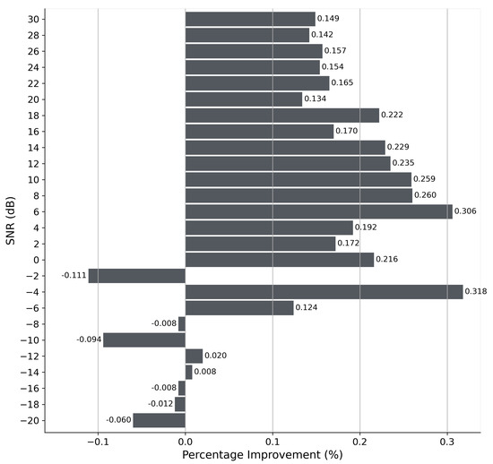 Illustrating enhancements across diverse SNR levels, Figure 5 presents the performance improvement (expressed as percentage accuracy) achieved through the employment of the SNR-informed architecture, contrasted with the baseline classification architecture detailed in []. While a marginal decline in performance was evident at  dB and a more substantial reduction at  dB, discernible enhancement is observable across most SNR conditions, with a pronounced emphasis on the desired range, spanning from  dB to  dB.