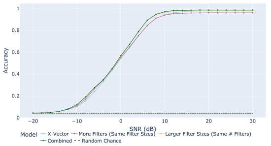 SNR vs. accuracy comparison of the initial investigation using the X-Vector baseline architecture []. Noticeable improvements can be observed across all SNRs.