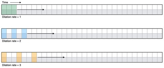 As proposed in [], Figure 8 depicts dilated convolutions, where the convolutional kernels are denoted by the colored components. In a traditional convolution, the dilation rate is equal to 1. Dilated convolutions build temporal context by increasing the receptive field of the convolutional kernels without increasing parameter counts, as the number of entries in the kernel remains the same.