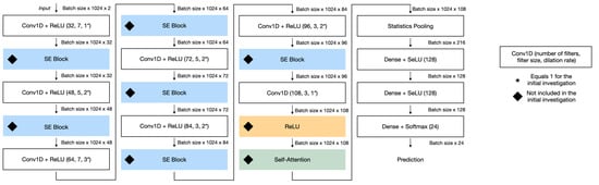 We also investigate the impact of using an activation function (ReLU) after the last convolutional layer, just before statistics pooling. Because ReLU transforms the input sequence to be non-negative, the distribution characterized by the pooling statistics may become skewed. In [,], no activation was applied after the final convolutional layer, as shown in Figure 3. We investigate if this transformation impacts classification performance.