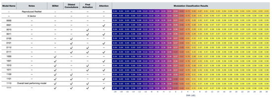 Figure 10 summarizes the ablation study in terms of classification accuracy over varying SNR levels. We add this figure for completeness and reproducibility for other researchers. The accuracy within each SNR band is shown along with the modifications used, similar to Table 3. The coloring in the figure denotes the accuracy in each SNR band. The performance follows a trend similar to that of a sigmoid function, where the rate at which peak classification accuracy is achieved is the most distinguishing feature between the different models. With the improved architectures, a maximum of 99% accuracy is achieved at high SNR levels (starting around 12 dB SNR).