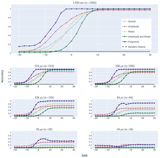For each signal duration in the time domain, we plot the overall classification accuracy over varying SNR conditions, as well as the accuracy for each modulation grouping defined in Section 3 in Figure 13, which demonstrates the trade-off for various signal durations, where n is the number of samples from the time domain I/Q signal. The first observation is, as we would expect, that classification performance degrades with decreased signal duration, similarly to []. For example, the maximum accuracy begins to degrade at 256 s and is more noticeable at 128 s. This is likely a result of using sample statistics that result in unstable or biased estimates for short signal lengths, since the number of received signal data points are insufficient to characterize the sample statistics used during training. Random classification accuracy is approximately 4% and is shown in the black dotted line in Figure 13. Although classification performance decreases with decreased duration, we are still able to achieve significantly higher classification accuracy than random chance, down to 16 s of signal capture.