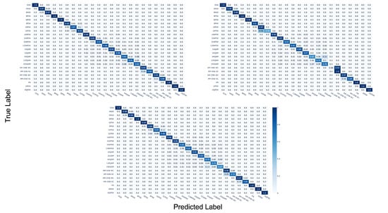 Confusion matrices for model 1110—the best-performing model from this work (top left), the reproduced ResNet model from [] (top right), and the X-Vector-inspired model from [] (bottom) with SNR ≥ 0 dB.