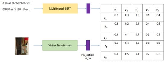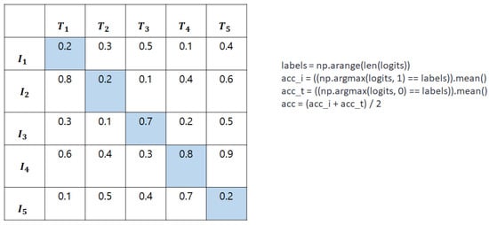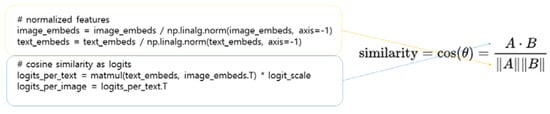 Figure 2 illustrates the method to obtain logits for a batch size of five. Here, logits represent the cosine similarity between the text and images. As Figure 3 shows, measuring the cosine similarity between text and images involved normalizing the feature vectors of both modalities and computing the matrix product. Cosine similarity ranged from −1 to 1, with higher values indicating greater similarity.