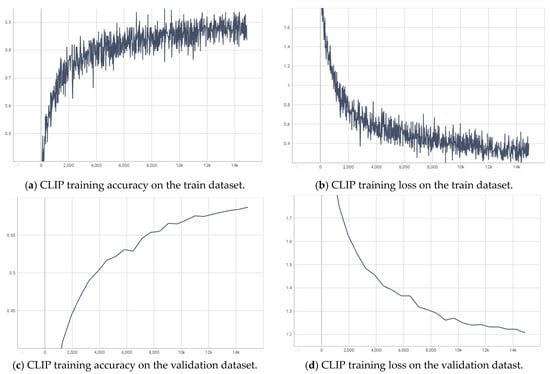 Graph of accuracy (a) and loss (b) during CLIP training on the train dataset. Graph of accuracy (c) and loss (d) during CLIP training on the validation dataset. The x-axis of accuracy (a,c) represents the training steps, and the y-axis represents accuracy. For loss (b,d) the x-axis represents training steps, and the y-axis represents loss.