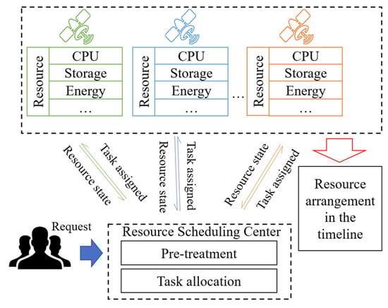 The resource scheduling center is responsible for receiving task requests from different users. Each request contains information such as the task’s priority, storage, energy resources required, and so on. The resource scheduling center then preprocesses the tasks, gets their execution time window, and converts them into storage, energy, and other resource requirements. At the same time, the capability status of executing satellites within the constellation is evaluated and transmitted to the center. Subject to various constraints of the satellite, the goal is the load balance of the entire satellite constellation while assigning each task to the satellite for execution. Each satellite will receive an unordered task list and arrange the necessary resources based on the task’s execution time window. Finally, a resource arrangement plan in the timeline is given. Figure 1 illustrates the satellite resource scheduling process. Table 2 summarizes the necessary notations used in this paper.