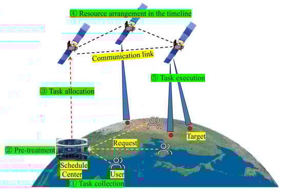 Increasing constellations and user demands bring more complexity to satellite resource scheduling. How to arrange tasks reasonably, optimize the allocation of onboard resources [], and maximize the service efficiency of satellites have become crucial and challenging issues in the satellite control system [,,]. On the one hand, the satellite is constantly in a highly dynamic environment. In the satellite resource scheduling process, it is crucial to consider spatio-temporal constraints. On the other hand, resources such as onboard storage and power are limited and significantly constrain the execution of satellite tasks. In addition, the adjustable degrees of freedom of onboard equipment have increased, making resource scheduling harder.
