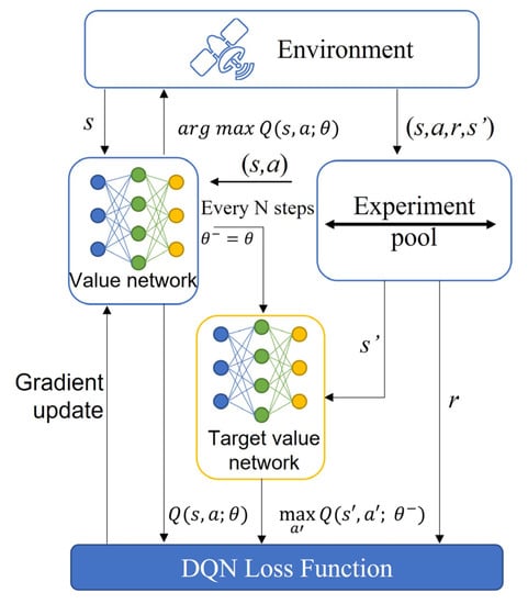 With the advancement of deep reinforcement learning, significant progress has been made in various fields. The problem is modeled as a finite Markov Decision Process (MDP) in reinforcement learning. The MDP is the theoretical framework for achieving goals through interactive learning. The agent is the part that performs the learning and implements the decisions [,]. Multi-agent system consists of multiple agents with different capabilities. Agents can operate collaboratively with each other through interaction to accomplish complex tasks. Multi-agent systems have better robustness and higher efficiency [,]. By continually interacting with the environment and receiving positive or negative feedback, agents can learn strategies that obtain long-term benefits in complex environments, leading to better decision making. The DQN algorithm breaks the limitation that Q-learning can only represent a limited state space. It adopts the experience replay mechanism, which improves the utilization of the training experience and attenuates the effect brought by the correlation of data sequences. It adopts a single-step updating method with high exploration efficiency [,]. Hence, it can be a valuable technique for optimizing the comprehensive utilization of satellite resources.