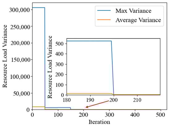 The process of pheromone updating includes both pheromone evaporation and pheromone reinforcement. At the end of each iteration, all elements in the pheromone matrix are multiplied by the pheromone evaporation rate. Next, the resource load rate of the task selection scheme provided by each ant is calculated. The scheme with the minor load variance among the distribution results in that iteration is then enhanced by the corresponding location pheromone. It is updated as Equation (13). a is the task selection matrix whose load variance is minimum.