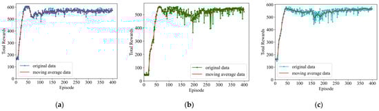 Convergence of the satellite resource scheduling system. (a) The 105 task training result on SAT1; (b) The 96 task training result on SAT2; (c) The 99 task training result on SAT3.