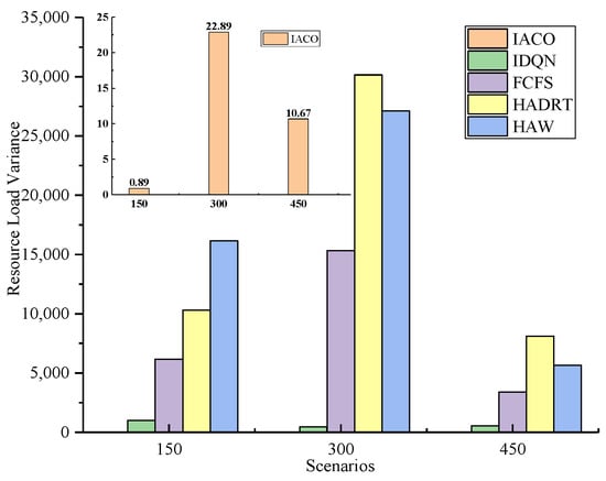 (2) The resource load rate, as defined in Equation (7), measures the variance of resource allocation across each satellite after resource scheduling. After employing four algorithms, Table 7 depicts each scenario’s resource allocation load status. Notably, following initial task allocation using the ant colony algorithm, the variance of resource load across satellites was significantly lower than the other three algorithms. After determining the optimal scheduling timing by IDQN, the resource load rate increased, but the variance of resource allocation remained lower than that of the other three algorithms. After two resource scheduling phases, the overall resource load displayed a relatively balanced distribution among satellites. Figure 9 illustrates the variance in the final number of executed tasks per satellite for each algorithm in each scenario, with the IACO-IDQN method demonstrating the most optimal performance. We repeat the simulation 10 times in the same scenario.