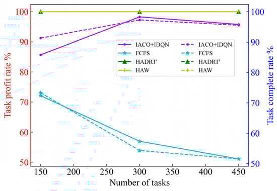 The task completion rate and task profit rate for four algorithms.